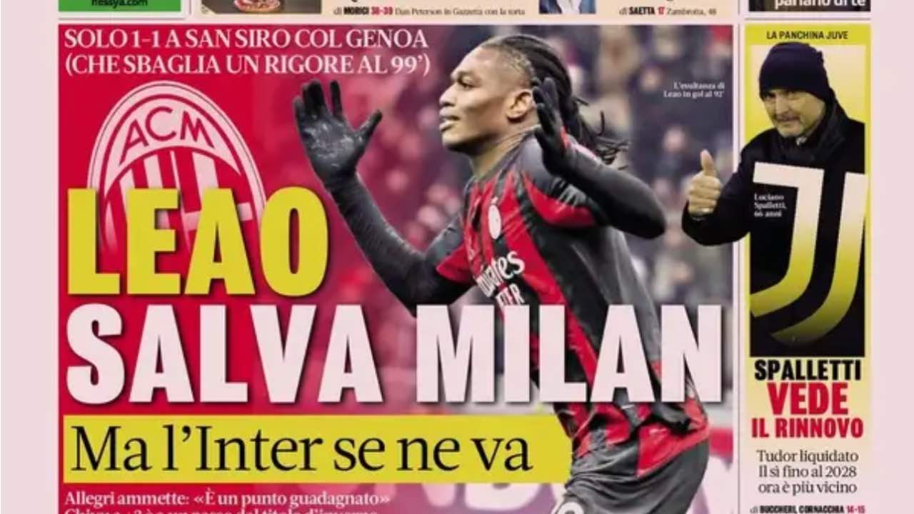 La Gazzetta dello Sport apre con il pareggio del Milan contro il Genoa grazie al gol di Leão nella ripresa e si focalizza già sul big match di domenica 11 gennaio tra Inter e Napoli.
