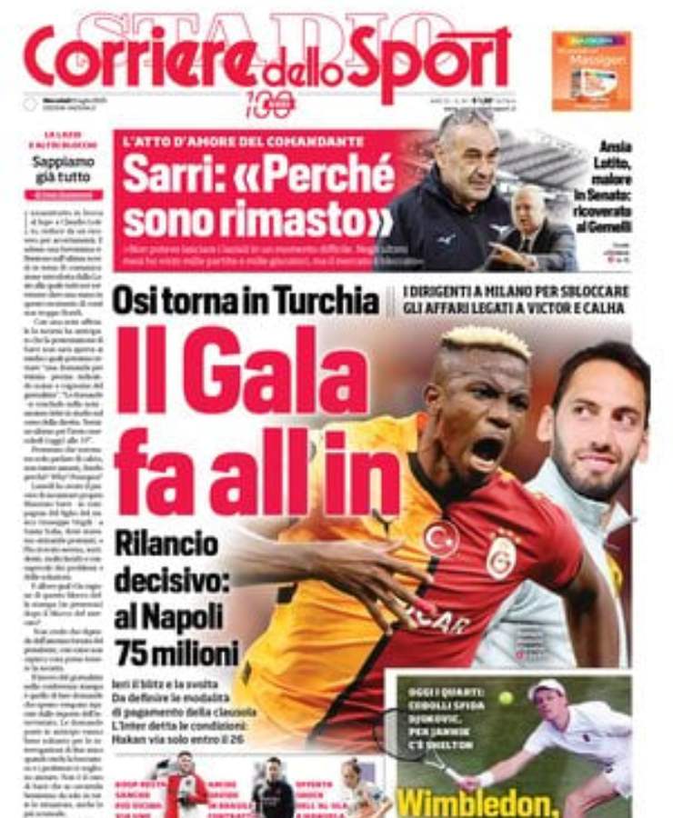 Il Corriere dello Sport apre con il ritorno di Osimhen in Turchia al Galatasaray: il club pagherà al Napoli la clausola di 75 milioni di euro. L’attaccante nigeriano, dunque, si trasferisce definitivamente salutando ancora una volta l’Italia.