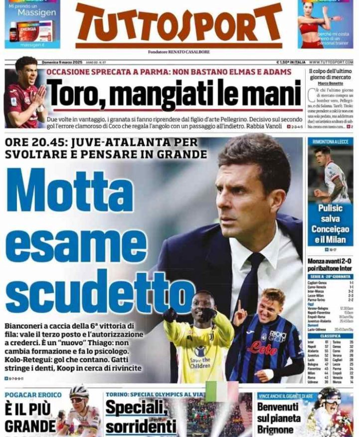 Tuttosport apre sulla Juventus e il suo “Esame scudetto”, con i bianconeri a caccia del sesto successo consecutivo. Taglio alto dedicato al Torino, che ha pareggiato contro il Parma nella giornata di ieri (8 marzo) .
