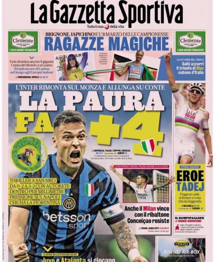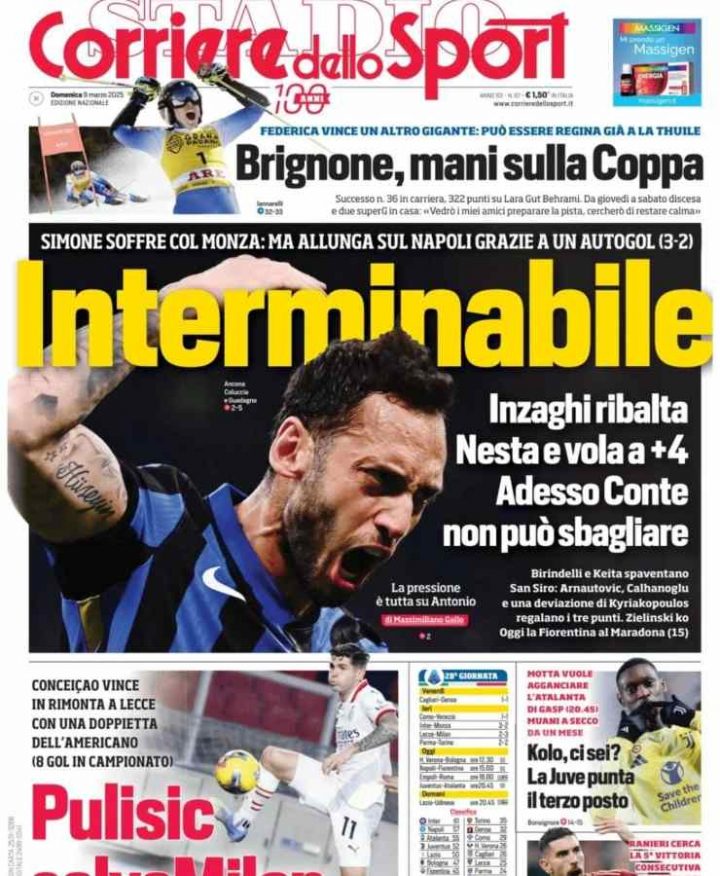 Anche il Corriere dello Sport apre sulla vittoria dell’Inter a Monza. Taglio basso dedicato al Milan e alla Juventus, che affronterà l’Atalanta per guadagnarsi il terzo posto in campionato.