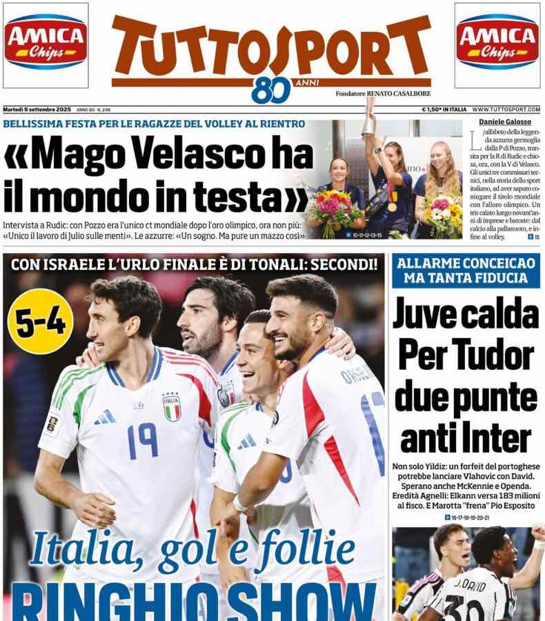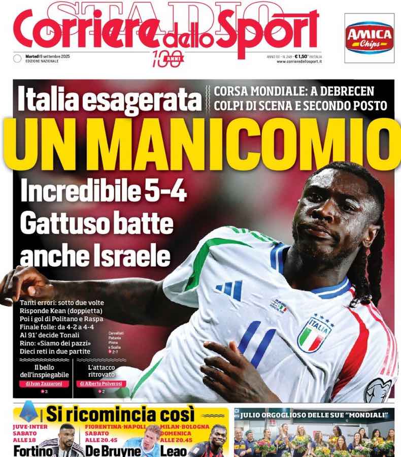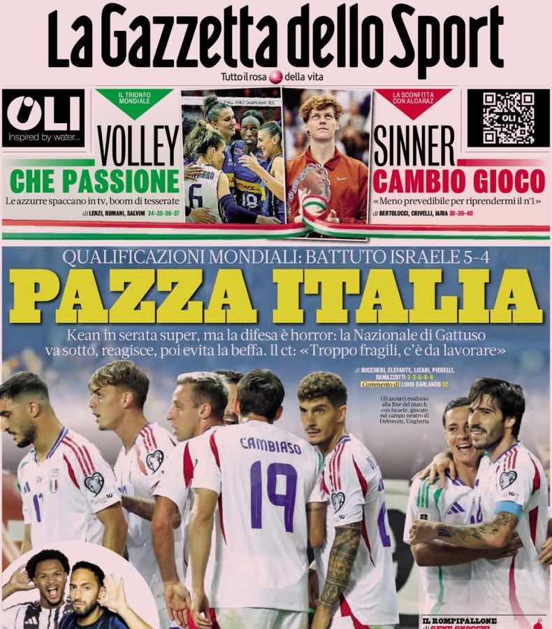 La Gazzetta dello Sport apre con il successo dell’Italia, per 5-4, ai danni dell’Israele nel match valido per le qualificazioni al Mondiale 2026.