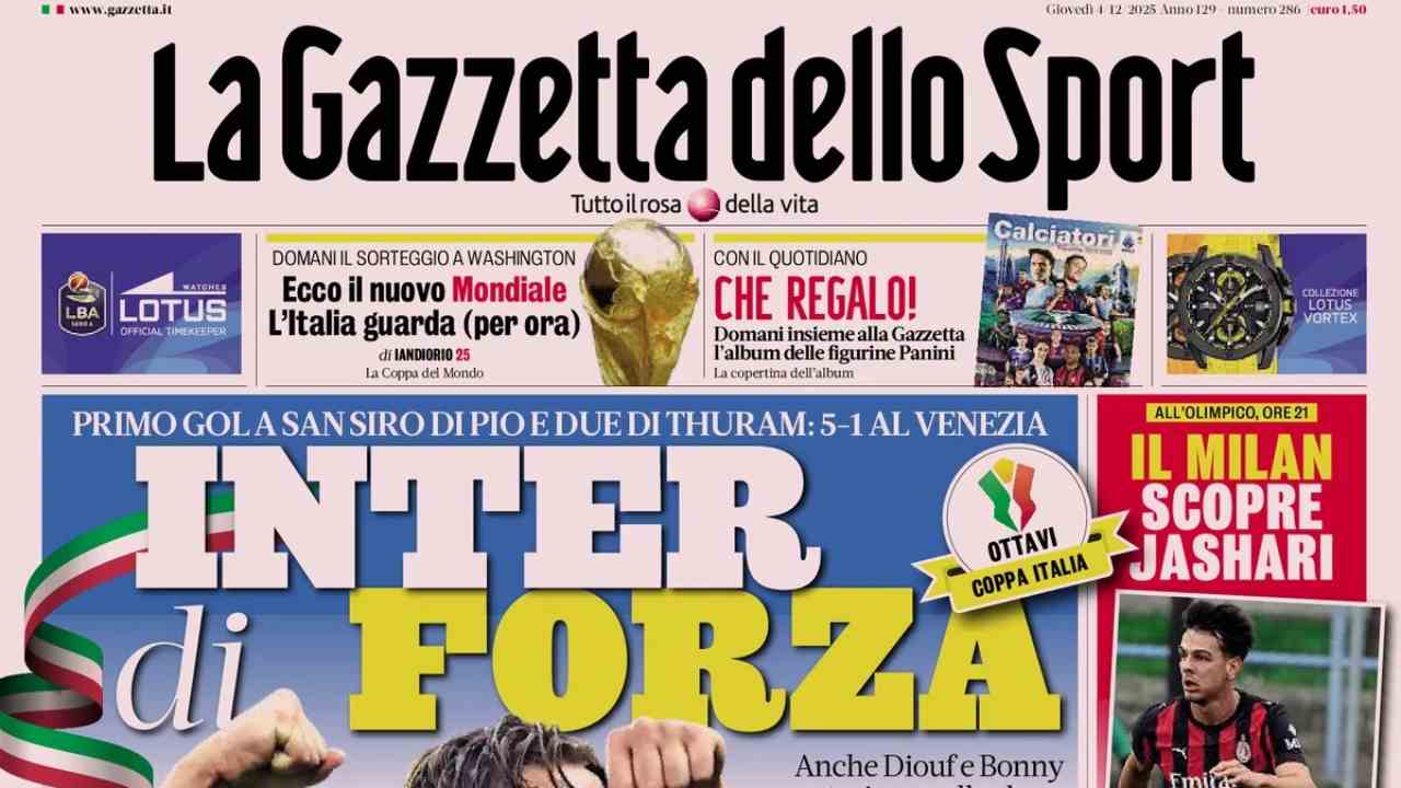 La Gazzetta dello Sport apre con la Coppa Italia concentrandosi sul successo dell’Inter a San Siro – per 5-1 – contro il Venezia. Primo gol di Pio Esposito davanti ai propri tifosi.