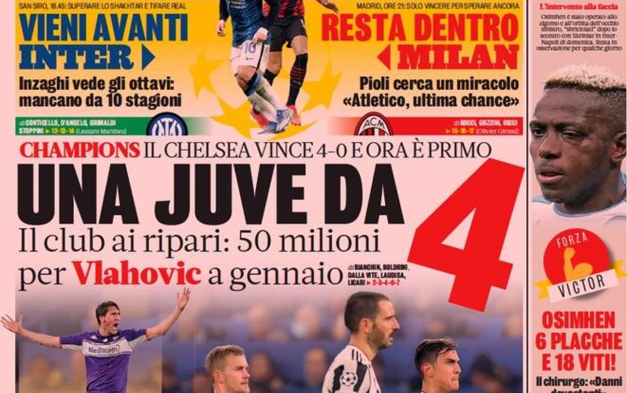 La Juventus crolla a Londra contro il Chelsea, Muriel salva l’Atalanta in Svizzera, l’Inter si prepara al match point contro lo Shakhtar mentre il Milan si gioca tutto a Madrid. Questi i temi principali dei quotidiani in edicola mercoledì 24 novembre 2021.