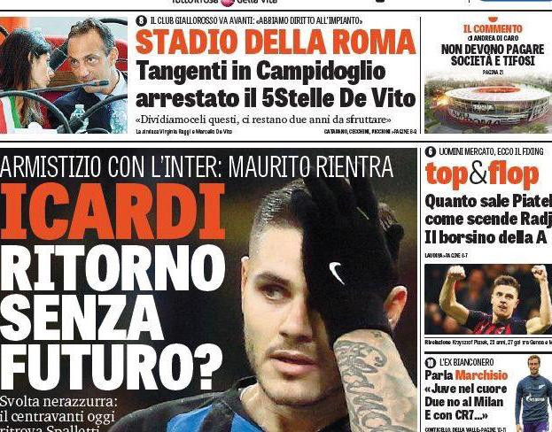 Il caso Icardi e la pace con l'Inter tiene banco nella prime pagine della rassegna stampa odierna. La Gazzetta dello Sport apre con l'ex capitano dell'Inter e titola: "Icardi ritorno senza futuro?" ipotizzando che il ritorno in campo e agli allenamenti con i compagni non significhi necessariamente che a fine anno resti ancora a Milano, sponda nerazzurra.