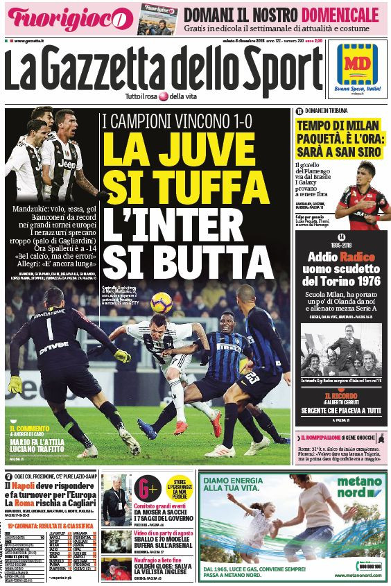 “La Juve si tuffa. L’Inter si butta”: questa l’apertura de La Gazzetta dello Sport, che si sofferma chiaramente sul successo della squadra di Allegri contro i nerazzurri di Spalletti. In spalla, spazio all’arrivo nelle prossime ore a Milano di Lucas Paquetà, pronto a vivere i suoi primi giorni da futuro giocatore del Milan (“Tempo di Milan: Paquetà, è l’ora. Sarà a San Siro”) , e alla scomparsa di Gigi Radice, “Uomo scudetto del Torino 1976”.