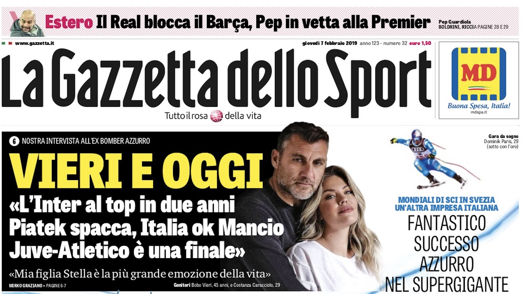 Taglio a un’intervista esclusiva per La Gazzetta dello Sport: “Vieri e oggi” è il titolo, con l’intervista a Bobo, ex bomber della Nazionale e di tante squadre blasonate. In basso, tre notizie di calcio: “Juve da ricaricare con vista Champions. Allegri, ci vuole una nuova magia“; “Falsa partenza. I cinesi non pagano, Hamsik stoppato rimane al Napoli“; “La A già in campo. Lazio da 4° posto occhio a Caputo: ‘Io a tutta birra’“.