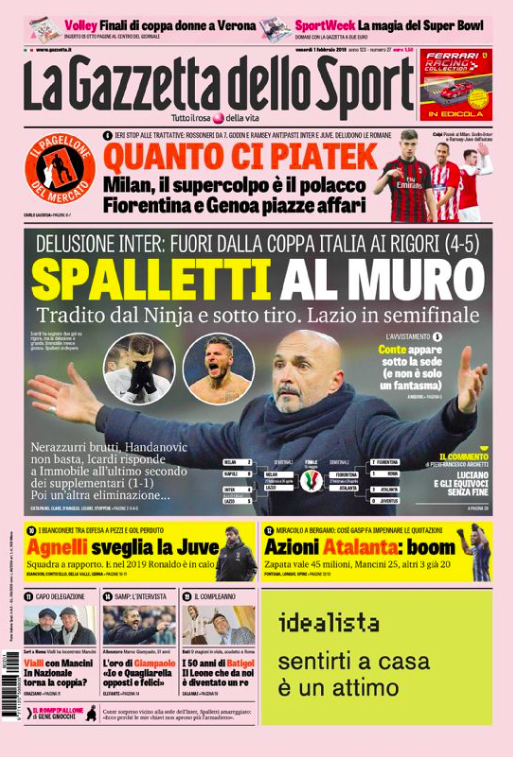 La Gazzetta dello Sport apre con la situazione di Spalletti post sconfitta dell’Inter in Coppa Italia contro la Lazio: “Spalletti al muro – Tradito dal Ninja e sotto tiro. Lazio in semifinale”. Taglio alto dedicato al pagellone del mercato (“Quanto ci Piatek: Milan, il supercolpo è polacco”): in basso, invece, spazio al momento di casa Juventus (“Agnelli sveglia la Juve”) e del picco nel valore dei cartellini di alcuni talenti della squadra di Gasperini (“Azioni Atalanta: boom”).