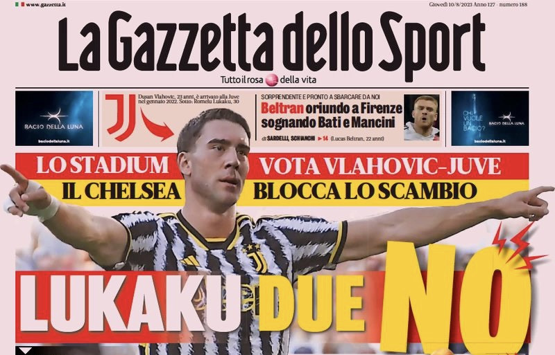 I quotidiani sportivi in edicola oggi, giovedì 10 agosto 2023, trattano di diversi argomenti fra cui spiccano il calciomercato estivo e le amichevoli e in particolare lo scambio Lukaku-Vlahovic e le prestazioni di Inter e Juventus.