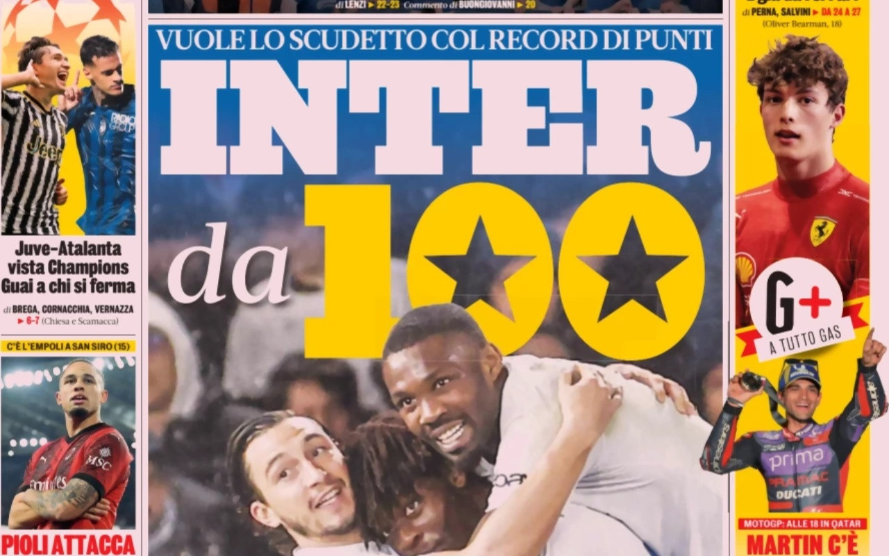 Le prime pagine sportive dei quotidiani in edicola oggi, domenica 10 marzo 2024, si concentrano sulla 28ª giornata di Serie A. Negli anticipi del sabato l’Inter ha battuto il Bologna a San Siro, prendendo ancora più vantaggio sulle inseguitrici in classifica. In zona salvezza vittoria fondamentali per Cagliari e Sassuolo, rispettivamente contro Salernitana e Frosinone. In serata, infine, bel successo del Monza per 3-2 in casa del Genoa. Sui quotidiani spazio anche alle restanti partite del turno che andranno in scena oggi: Lecce-Verona, Milan-Empoli, Juventus-Atalanta e Fiorentina-Roma.