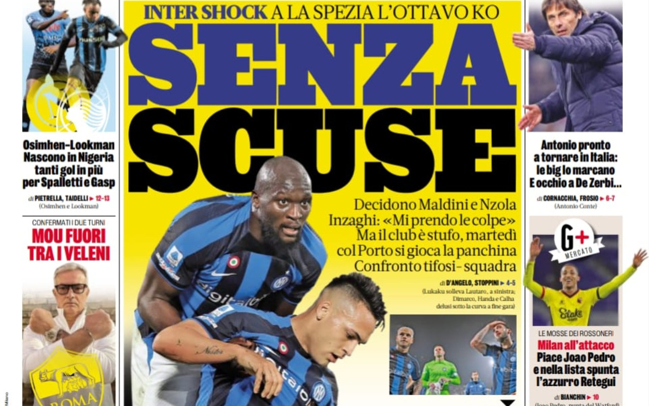 Le prime pagine sportive dei quotidiani in edicola sabato 11 marzo si concentrano sulla sconfitta dell’Inter a La Spezia e sulla chance per il Napoli di volare a +18 approfittando della sconfitta dei nerazzurri in occasione della sfida casalinga con l’Atalanta (ore 18). Ampio spazio anche al respingimento del ricorso avverso la squalifica per due giornate a Mourinho e alla Juventus con gli ultimi aggiornamenti sulla battaglia legale per il caso plusvaleneze.