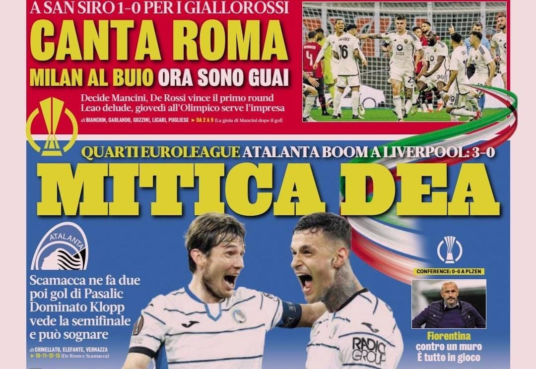 Le prime pagine sportive in edicola oggi, venerdì 12 aprile, si concentrano sui risultati delle squadre italiane nelle gare d’andata dei quarti di finale di Europa e Conference League. La Fiorentina non va oltre lo 0-0 contro il Viktoria Plzeň. A San Siro, il match tra Milan e Roma termina 0-1 grazie alla reate di Mancini. Le prime pagine dedicano grande spazio all’impresa dell’Atalanta che vince 0-3 contro il Liverpool, ad Anfield.