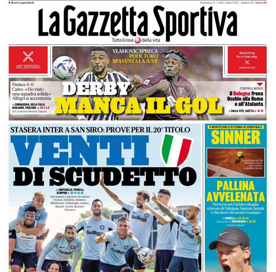 Le prime pagine sportive in edicola oggi, domenica 14 aprile, si concentrano sulla Serie A. Prosegue la 32esima giornata di campionato dopo il pareggio nel derby tra Torino e Juventus. Oggi in campo il Napoli, contro il Frosinone, il Milan, ospite del Sassuolo, e l’Inter, contro il Cagliari.