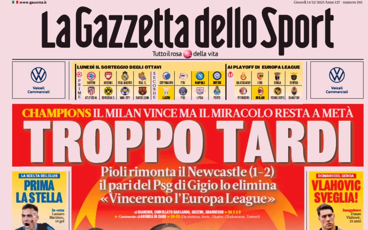 Le prime pagine sportive dei quotidiani in edicola giovedì 14 dicembre 2023 si concentrano sulla chiusura dei gironi della Champions League 2023/2024, con la retrocessione del Milan in Europa League e il passaggio della Lazio da seconda in classifica. Spazio però anche per il ricordo di Juliano e per il rinnovo di Osimhen con il Napoli.