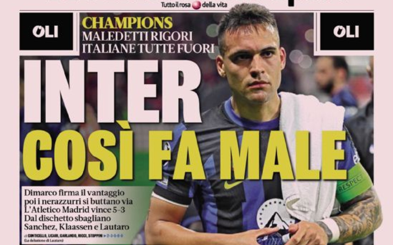 Le prime pagine sportive dei quotidiani in edicola oggi, giovedì 14 marzo, si concentrano sull’eliminazione dalla Champions League dell’Inter dopo la sconfitta ai rigori nel match contro l’Atletico Madrid. Spazio anche all’Europa League, con il Milan impegnato alle 18:45 sul campo dello Slavia Praga. La Roma di Daniele De Rossi invece sarà sul campo del Brighton per difendere il 4-0 dell’andata, mentre l’Atalanta accoglierà a Bergamo lo Sporting Lisbona. In Conference League invece la Fiorentina sfida il Maccabi Haifa al Franchi.