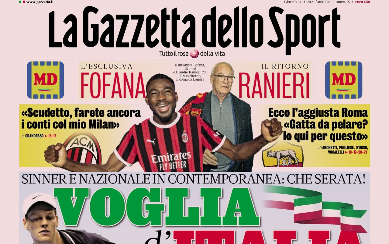 Le prime pagine dei quotidiani sportivi di oggi, giovedì 14 novembre, si concentrano sul ritorno di Claudio Ranieri sulla panchina della Roma. Ampio spazio anche all’Italia di Luciano Spalletti che – giovedì 14 novembre – affronterà il Belgio nella gara di Nations League a partire dalle 20:45.
