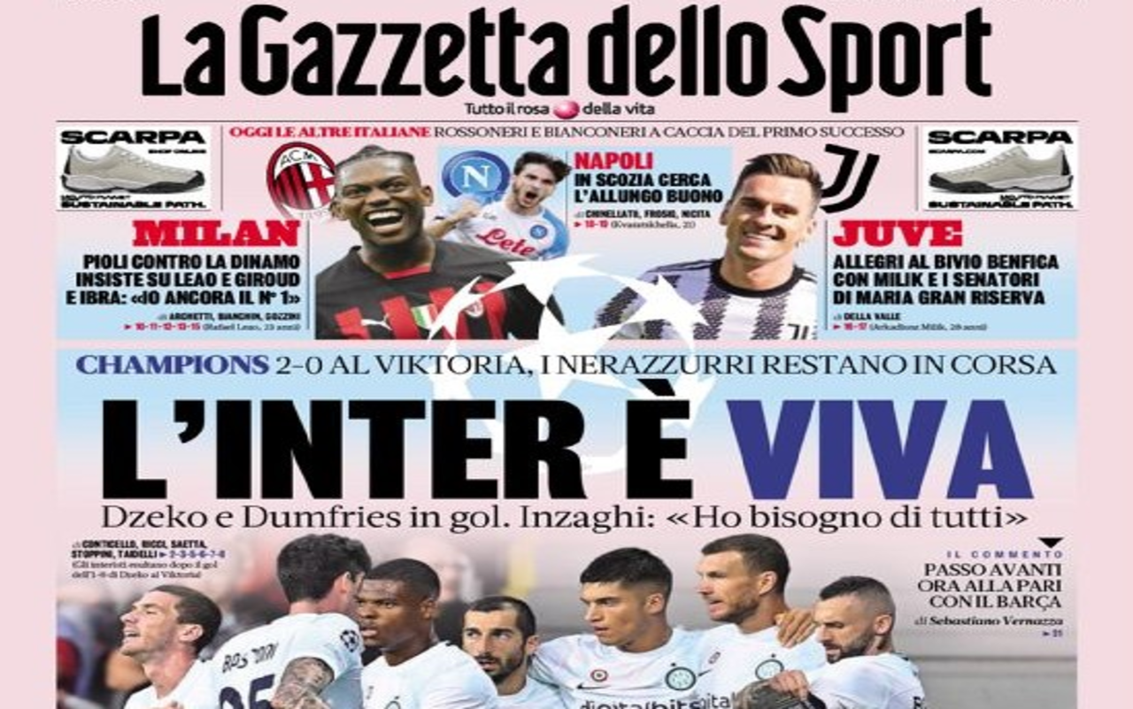 I risultati delle partite di Champions League del martedì, con la vittoria dell’Inter contro il Viktoria Plzen, le gare di oggi con Napoli, Juventus e Milan in campo, ma anche al mercato e al campionato. Questi i principali temi delle prime pagine dei quotidiani sportivi in edicola oggi.