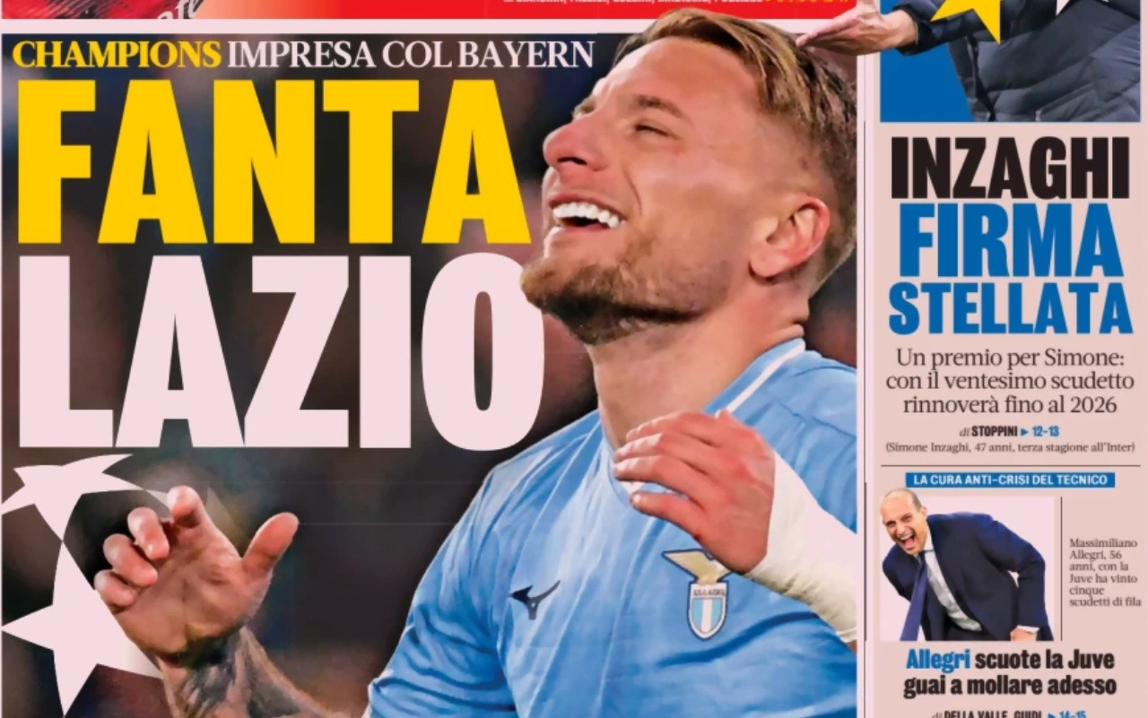 Le prime pagine sportive dei quotidiani in edicola giovedì 15 febbraio si concentrano sugli ottavi di finale di Champions League, che hanno visto la grande vittoria della Lazio di Maurizio Sarri contro il Bayern Monaco. Successo anche per il PSG, che si è imposto per 2-0 contro la Real Sociedad. Spazio anche ai temi dell’Europa League, che vedrà impegnati Roma e Milan, rispettivamente contro Feyenoord e Rennes. Spazio, infine, anche al calciomercato.