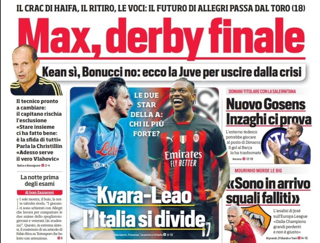Dall’imminente derby della Mole tra Torino e Juventus al ballottaggio tra Rafael Leao e Kvaratskhelia, questi e molti altri i temi affrontati nelle prime pagine dei principali quotidiani sportivi in edicola oggi, sabato 15 ottobre.