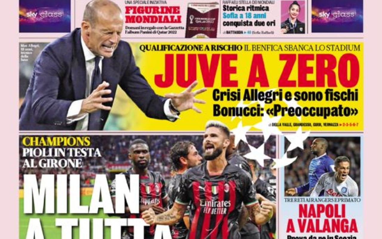 I risultati delle partite di Champions League del mercoledì, con la vittoria del Milan contro la Dinamo Zagabria, la disfatta della Juve contro il Benfica e la bella vittoria del Napoli in casa dei Rangers. Questi i principali temi delle prime pagine dei quotidiani sportivi in edicola oggi.