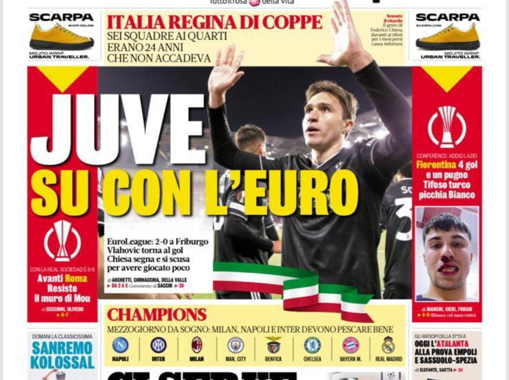 Juventus e Roma si qualificano ai quarti di Europa League, così come la Fiorentina avanza ai quarti di Conference League. Eliminata invece la Lazio dopo la sconfitta contro l’AZ: questi e tanti altri i temi affrontati nelle prime pagine sportive dei quotidiani in edicola oggi, venerdì 17 marzo 2023.