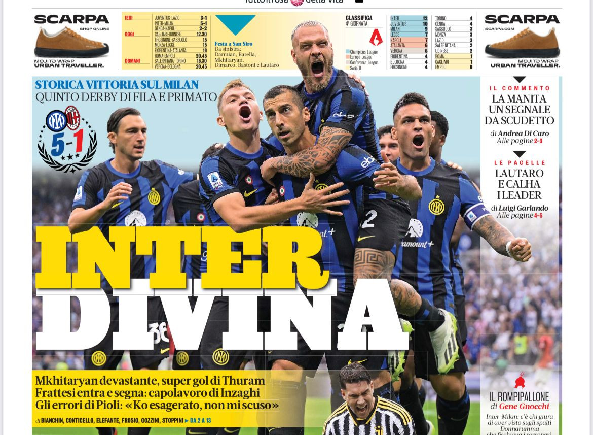 Dopo la sosta per le Nazionali, è ufficialmente ripresa la Serie A. La 4a giornata si è aperta con l’incontro fra Juventus e Lazio, vinto dai bianconeri per 3-1. A seguire si è giocato l’attesissimo derby di Milano, che ha visto l’Inter surclassare i rivali rossoneri con un netto 5-1. Per finire, in serata, Genoa e Napoli hanno pareggiato 2-2 al Ferraris. Questi e altri temi sono ripresi dai principali quotidiani sportivi nell’edizione di oggi.
