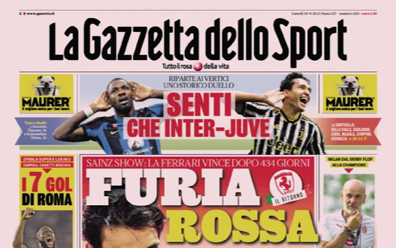 Le prime pagine sportive dei quotidiani in edicola lunedì 18 settembre si concentrano sulla domenica di Serie A, con attenzione particolare alla larghissima vittoria della Roma di Mourinho contro l’Empoli di Zanetti e alla rimonta della Fiorentina di Italiano sull’Atalanta di Gasperini. Spazio anche per la Juventus, il Napoli e le altre gare di Serie A.