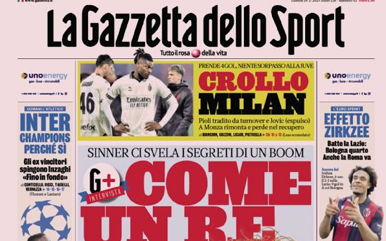 Le prime pagine sportive dei quotidiani in edicola oggi, lunedì 19 febbraio, si concentrano sulle partite della 25ª giornata di Serie A andate in scena ieri. Il Bologna ha battuto la Lazio all’Olimpico, la Roma ha stravinto 0-3 in casa del Frosinone, mentre il Milan ha perso 4-2 a Monza.