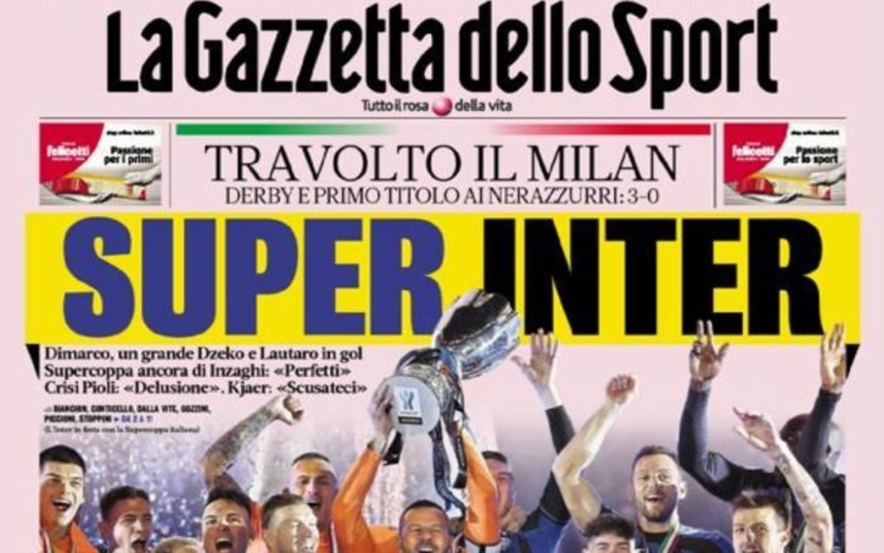 L’Inter batte il Milan nella finale di Supercoppa Italiana conquistando il settimo titolo nella storia della competizione: “Super Inter”; “Re di Coppe”. E poi spazio anche all’assemblea degli azionisti con le parole del nuovo cda bianconero: “Siamo sempre la Juve”, “La nuova Juve riparte da zero”. Questo e molto altro nelle prime pagine dei quotidiani sportivi, oggi in edicola.
