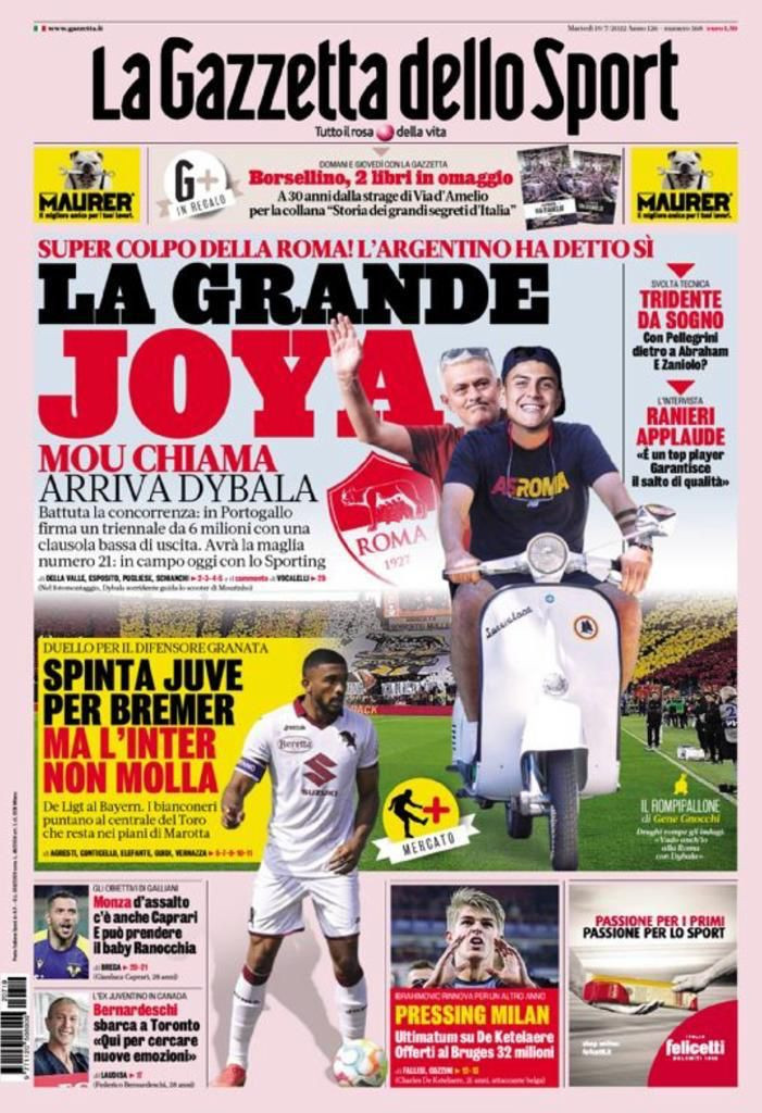 Altra giornata molto importante per quanto riguarda il calciomercato. Dal trasferimento di Dybala alla Roma fino alle due trattative sul tavolo del Torino che coinvolgono il futuro di Bremer, in bilico tra Inter e Juventus. Questi e tanti altri i temi affrontati nelle prime pagine sportive dei quotidiani in edicola oggi, martedì 19 luglio 2022.