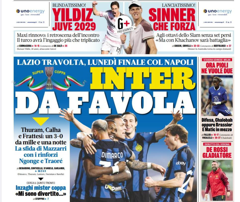 La seconda semifinale di Supercoppa Italiana vinta dall’Inter contro la Lazio, la Serie A e il calciomercato: le prime pagine dei quotidiani sportivi in edicola oggi, sabato 20 gennaio.