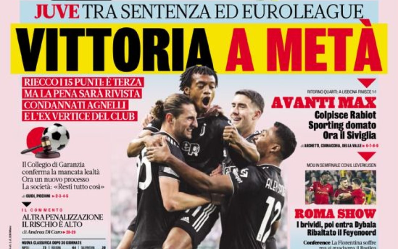 Momento d’oro per il calcio italiano, che porta ben cinque squadre su 12 totali alle semifinali delle tre competizioni europee. Spicca il derby europeo tra Inter e Milan in Champions League, ma Roma e Juventus guadagnano le semifinali di Europa League, mentre la Fiorentina passa in Conference League. Inoltre, cambia anche la classifica di campionato: per la 31ª giornata si ripartirà con la Juventus terza a 59 punti, visto che è stata almeno momentaneamente annullata la penalizzazione di 15 punti.