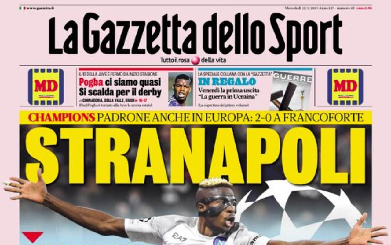 Nei principali quotidiani sportivi in edicola oggi, mercoledì 22 febbraio, ampio spazio alla Champions League, con la vittoria del Napoli contro l’Eintracht e con l’Inter impegnata stasera contro il Porto. Poi spazio alle gare di ritorno di Europa League e Conference League con impegnate Juventus, Lazio e Fiorentina.