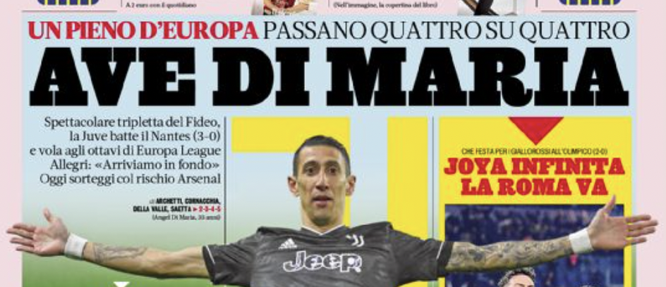 Nei principali quotidiani sportivi in edicola oggi, venerdì 24 febbraio, ampio spazio alle coppe europee: en plein delle italiane tra Europa League e Conference League. Juve e Roma battono rispettivamente Nantes e Salisburgo e volano agli ottavi di Europa League, mentre Lazio e Fiorentina – forti del vantaggio dell’andata – si qualificano per gli ottavi di Conference League.