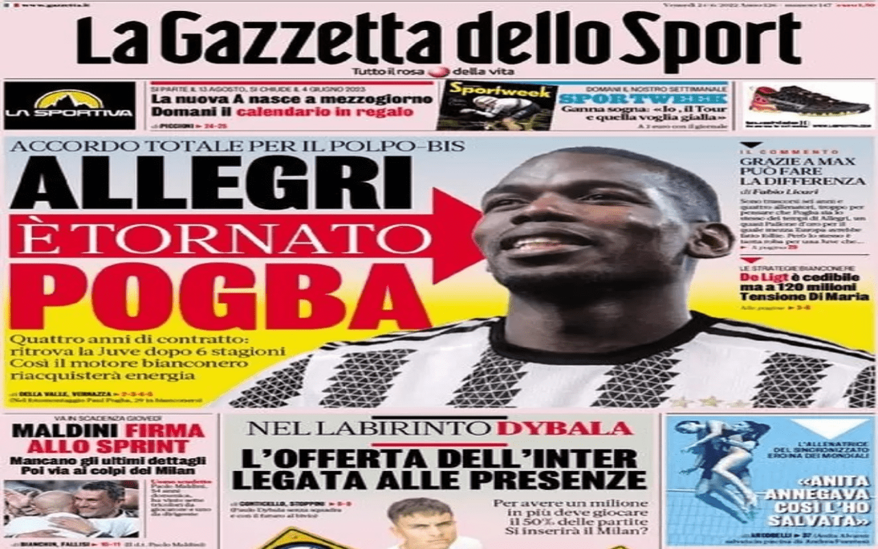 Le prime pagine sportive dei quotidiani in edicola venerdì 24 giugno si concentrano naturalmente sui movimenti di calciomercato, soprattutto sulle entrate e uscite di Juventus, Inter, Napoli e Monza, ma c’è spazio anche per l’Atalanta e il Cagliari. Inoltre, venerdì 24 giugno, sarà anche la data del sorteggio del calendario della stagione 2022/23 di Serie A.