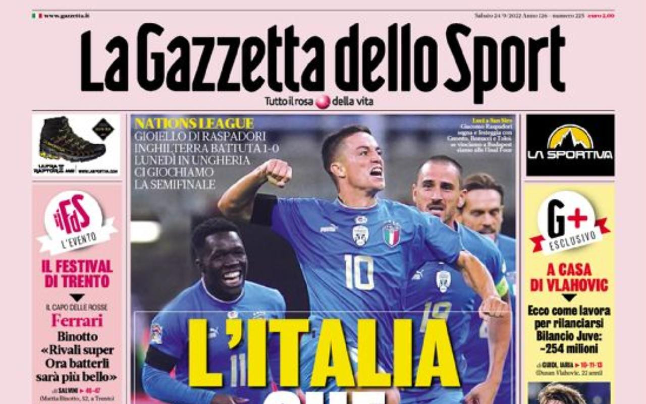 L’Italia vince e può ancora sperare nel primo posto nel girone di Nations League, l’Inghilterra è condannata alla retrocessione. Manca una partita adesso al termine di questa sosta nazionali, l’ultima prima del Mondiale. Questi i temi principali sulle prime pagine dei quotidiani in edicola sabato 24 settembre 2022.