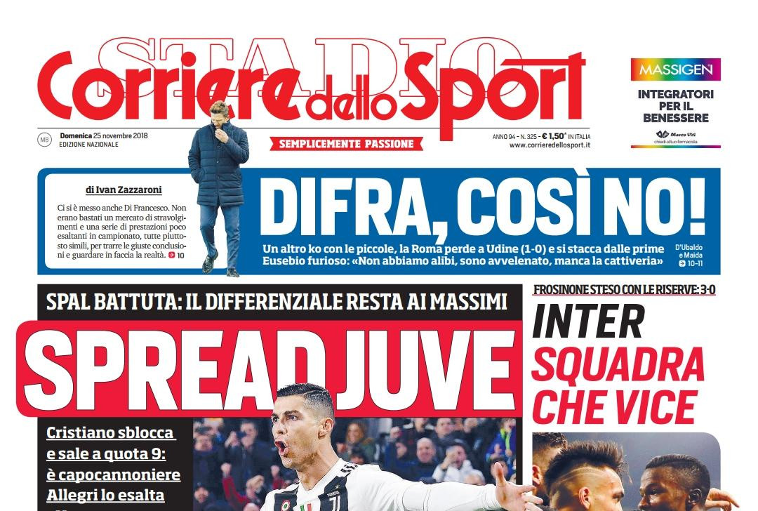 “Spread Juve”, così titola in prima pagina l’edizione odierna del Corriere dello Sport che apre con il successo dei bianconeri sulla Spal. Spazio anche all’Inter e al 3-0 a San Siro contro il Frosinone. In alto: “DiFra, così no!” e si passa alla Roma. In basso: “Vergognosi i cori anti napoletani a Udine e Torino”. Si legge anche della Premier League (“Cade Sarri, festa Ranieri”) e del “Putiferio Libertadores”.