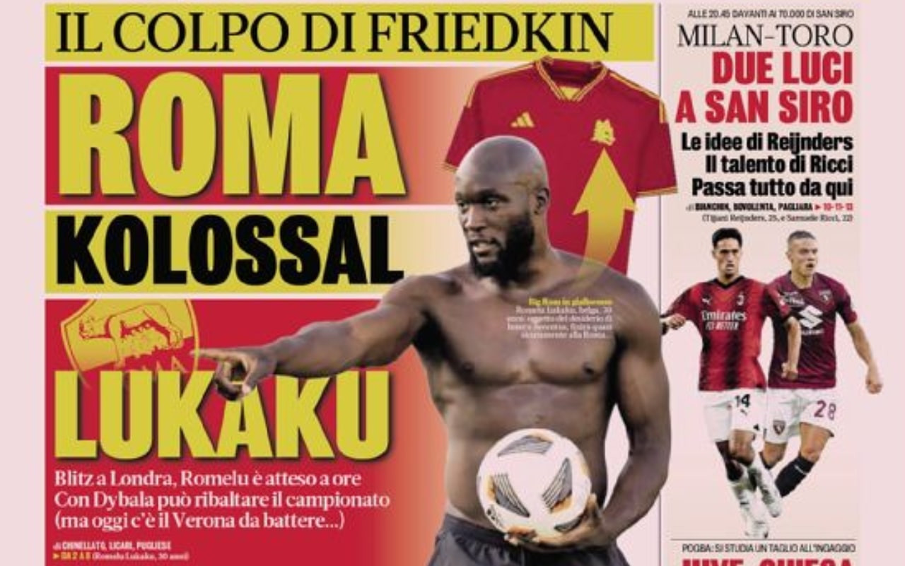 Le prime pagine sportive dei quotidiani in edicola sabato 26 agosto 2023 si concentrano, come sempre, sulle mosse di calciomercato: ampio spazio per l’operazione Lukaku-Roma, sempre più vicina alla definizione. Ma c’è spazio anche per il calcio giocato: comincia la seconda giornata di Serie A.