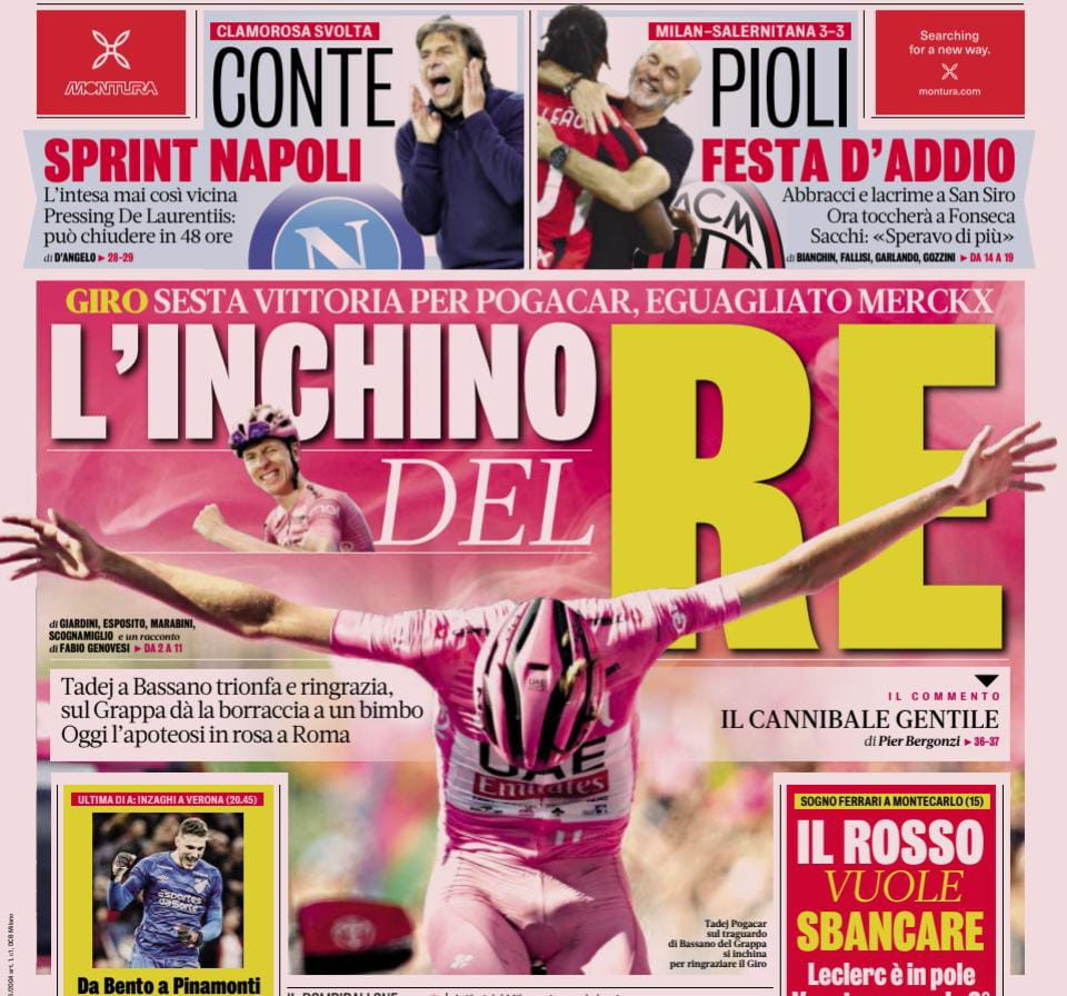 Le prime pagine sportive dei quotidiani in edicola oggi, domenica 26 maggio 2024, si concentrano sul saluto di Pioli al Milan, sul futuro di Gasperini e sulla panchina del Napoli. Spazio anche all’ultima giornata di Serie A.