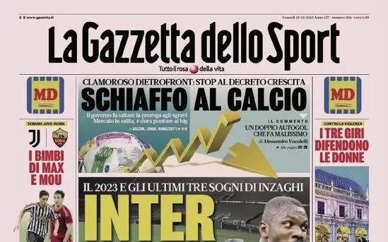 Le prime pagine sportive dei quotidiani in edicola oggi, venerdì 29 dicembre, si concentrano sulle partite di campionato di questa sera che daranno il via alla 18a giornata. Occhio anche al mercato e allo stop al Decreto Crescita.