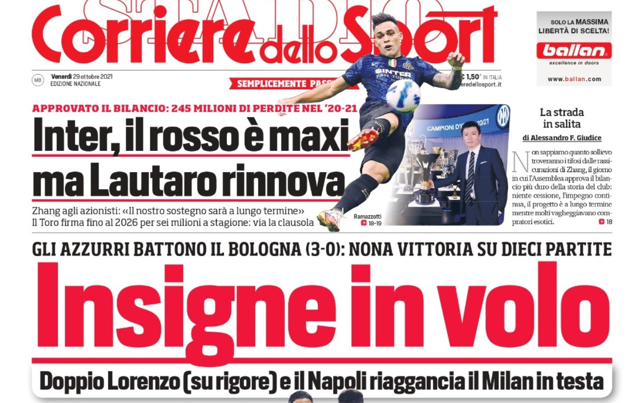 Nelle prime pagine dei quotidiani sportivi in edicola oggi, venerdì 29 ottobre 2021, spazio alla Serie A e ai risultati della decima giornata, oltre al tema legato al mercato e al rinnovo di Lautaro Martinez con l’Inter.