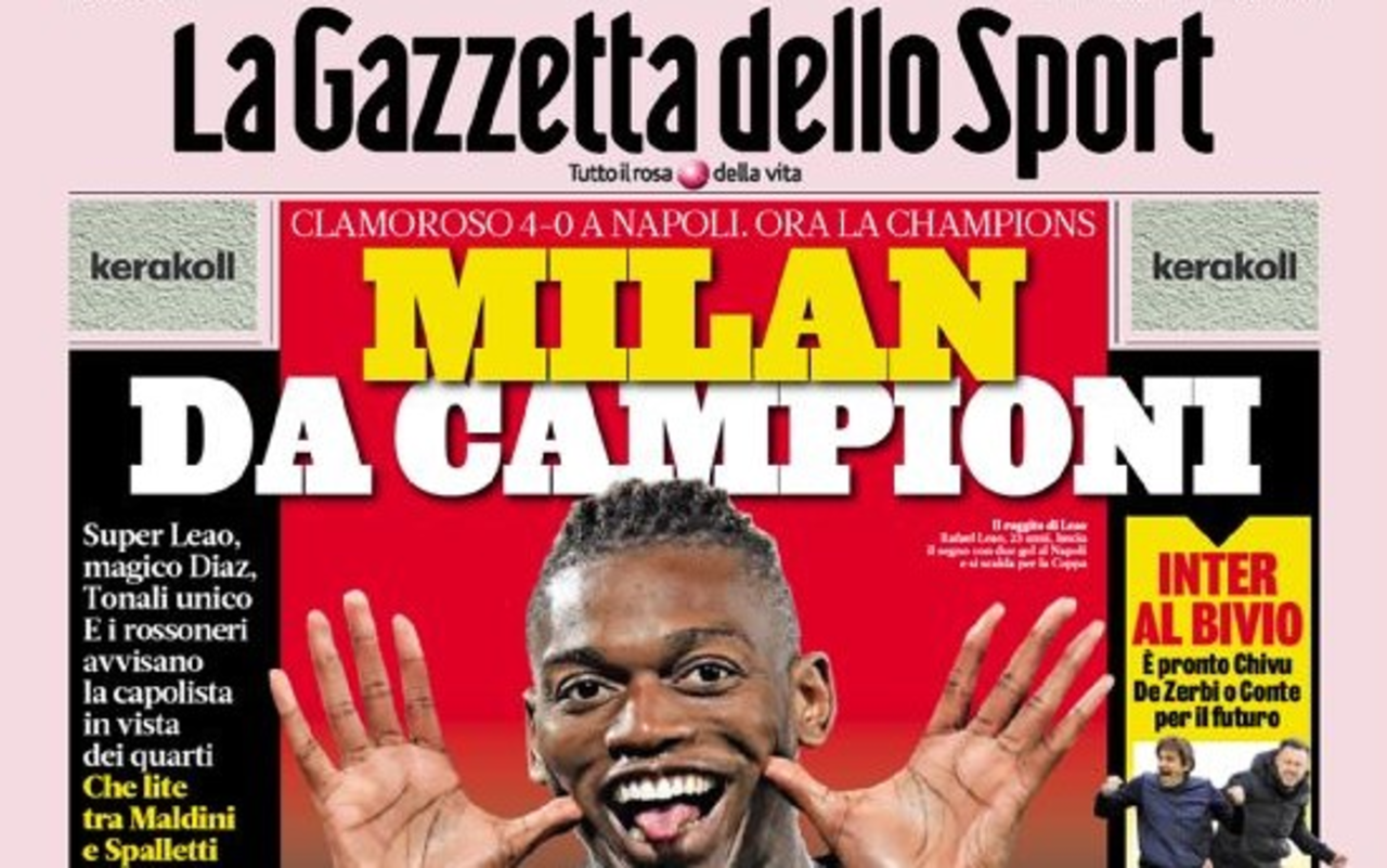 Le prime pagine dei quotidiani sportivi sono dedicate proprio ai risultati della domenica di Serie A. Inaspettata la sconfitta del Napoli per 0-4 contro il Milan. Vince la Lazio che allunga sulle inseguitrici. Stasera Empoli-Lecce e Sassuolo-Torino chiudono la giornata di Serie A. Questi i temi principali dei quotidiani in edicola oggi.