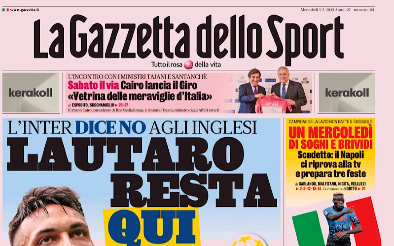 Il Napoli si prepara a vivere la festa scudetto, solo sfiorata in occasione dell’ultimo match interno contro la Salernitana. Le prossime 40 ore potrebbero essere quelle che assegneranno il titolo agli azzurri, può farlo in primis la Lazio quest’oggi, mercoledì 3 maggio 2023, non vincendo contro il Sassuolo. In caso di vittoria dei biancocelesti, invece, il Napoli dovrà evitare la sconfitta contro l’Udinese giovedì 4 maggio per celebrare il suo terzo scudetto tanto atteso. Questo e non solo nelle prime pagine dei quotidiani sportivi di quest’oggi.