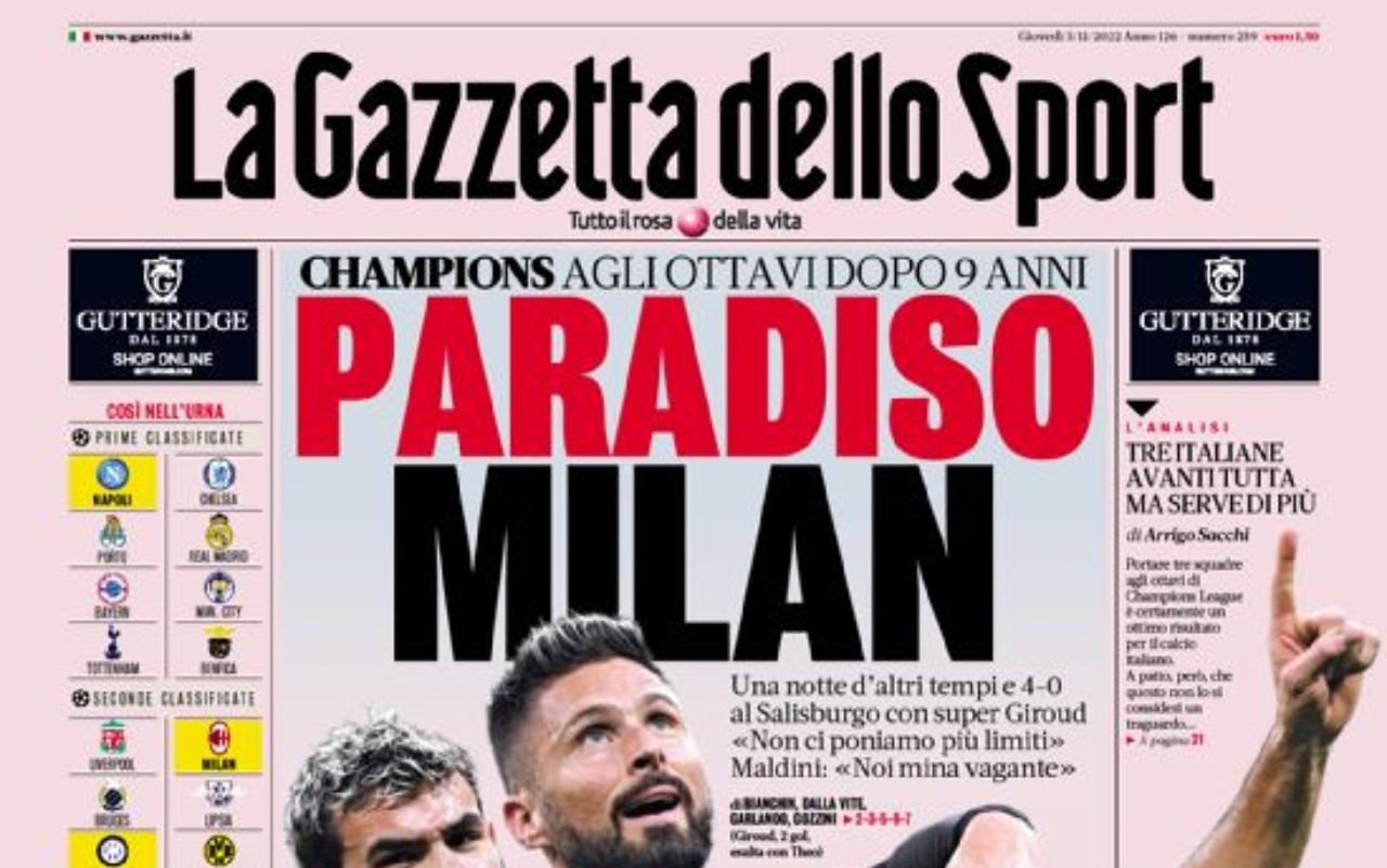 Le prime pagine dei quotidiani in edicola oggi, giovedì 3 novembre 2022, si concentrano sui risultati delle squadre italiane in Champions di mercoledì, quindi sulla vittoria del Milan (4-0 al Salisburgo), che consegna ai rossoneri il passaggio agli ottavi, e sulla sconfitta della Juventus (1-2 col Psg), che non compromette il passaggio ai sedicesimi di Europa League.
