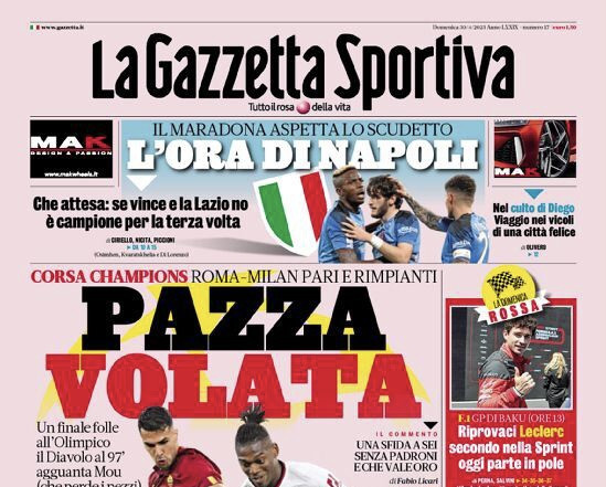 L’attesa del Napoli – a un passo dal terzo scudetto della sua storia -, il pareggio tra Roma e Milan e la situazione in casa Juventus: questo e molto altro nelle prime pagine dei quotidiani sportivi e non in edicola oggi, 30 aprile.