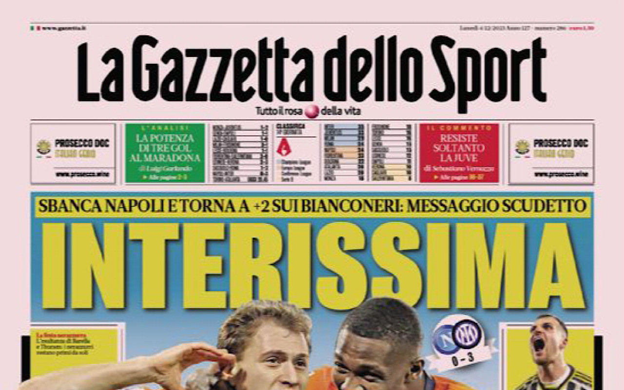 Le prime pagine sportive dei quotidiani in edicola oggi, lunedì 4 dicembre, si concentrano sui risultati delle partite di ieri. In particolare Napoli-Inter, big match di giornata finito 0-3 per i nerazzurri, non senza polemiche da parte dell club campano. Spazio anche alla premiazione di Bellingham per il Golden Boy, in programma stasera a Torino.