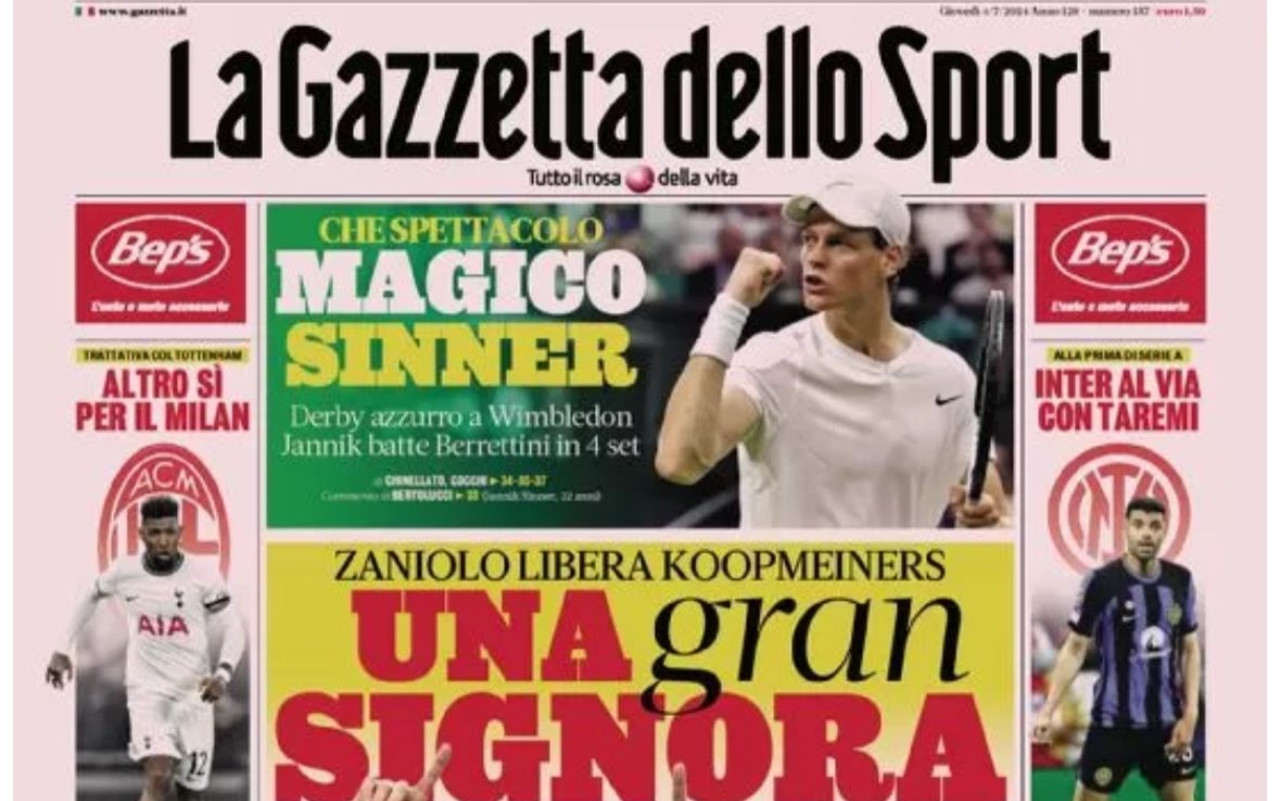 Le prime pagine dei quotidiani sportivi in edicola oggi, giovedì 4 luglio 2024 sono tutte concentrate sul calciomercato, gli Europei e Wimbledon.