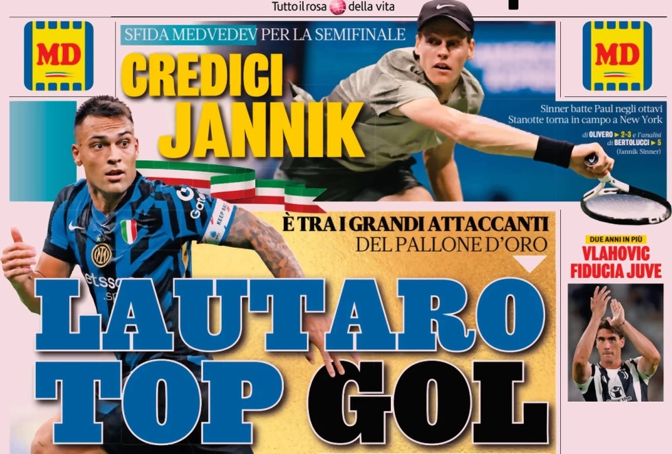 Le prime pagine sportive dei quotidiani in edicola oggi, mercoledì 4 settembre 2024, si concentrano sul calcio, con l’arrivo di Hummels a Roma e quella che sarà la lista dei trenta candidati al pallone d’oro, e sul tennis, con Sinner impegnato ai quarti di finale di US Open.