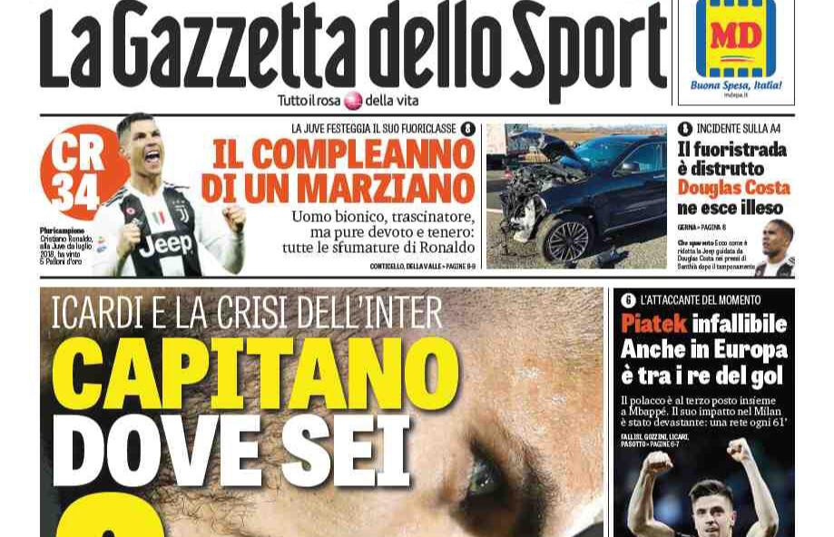 “Capitano, dove sei?”, titola La Gazzetta dello Sport, affrontando il tema della crisi dell’Inter e di Icardi. Poi “Il compleanno di un marziano, CR34″ si legge in alto, mentre il trafiletto laterale è dedicato a Piatek e alle partite di ieri: “Piatek infallibile, anche in Europa è tra i re dei gol”, “Colpi Atalanta e Lazio, mucchio selvaggio per la Champions”
