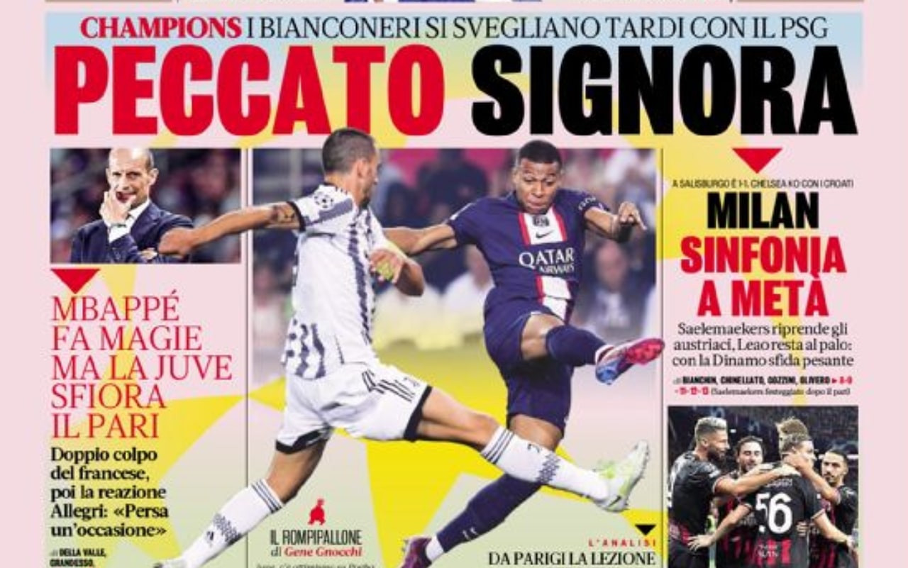 Prime pagine dei quotidiani portivi dedicate al martedì di Champions League, con la sconfitta della Juventus contro il PSG e il pareggio del Milan in casa del Salisburgo. Questi e molti altri temi nelle prime pagine dei quotidiani sportivi in edicola mercoledì 7 settembre 2022.