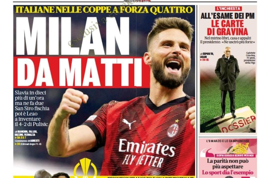 Le prime pagine sportive dei quotidiani in edicola venerdì 8 marzo 2024, Giornata internazionale dei diritti delle donne, si concentrano sui successi delle squadre italiane nelle competizioni europee: spazio alla Roma, al Milan e alla Fiorentina. Ma si parla anche di Juventus, e di Napoli-Torino, primo anticipo della 28esima giornata di Serie A.